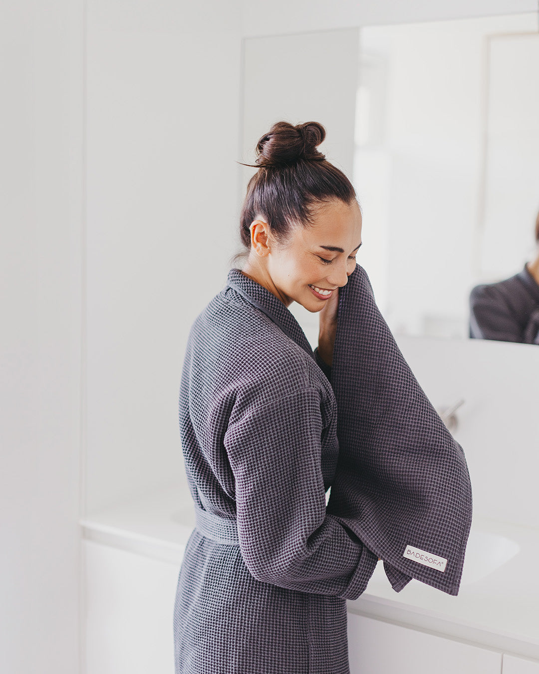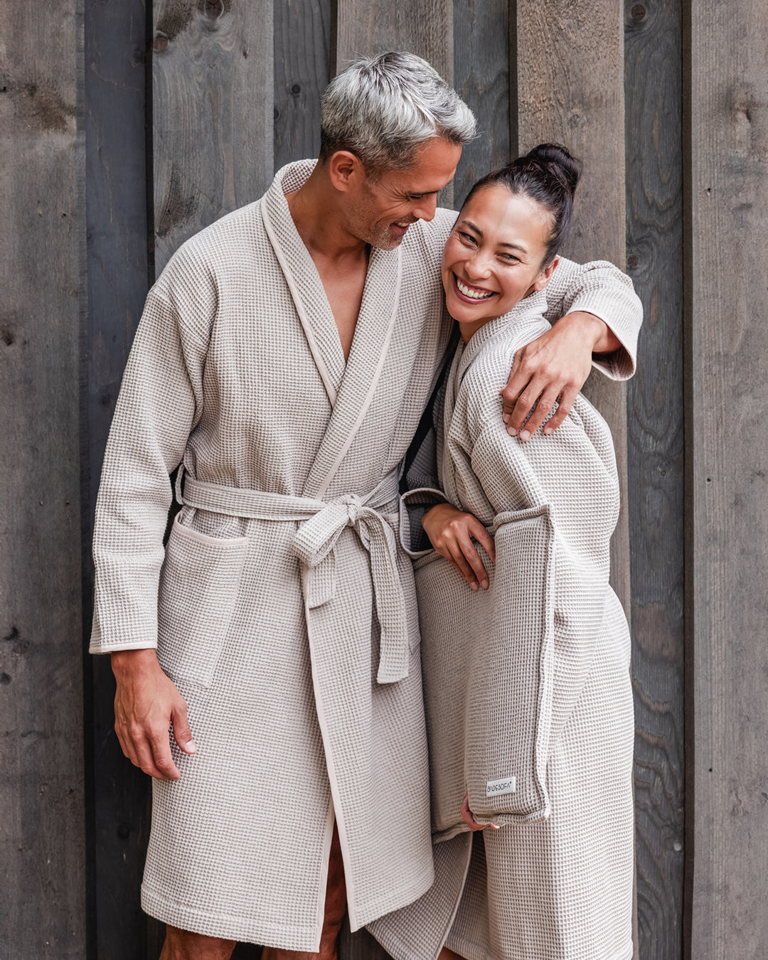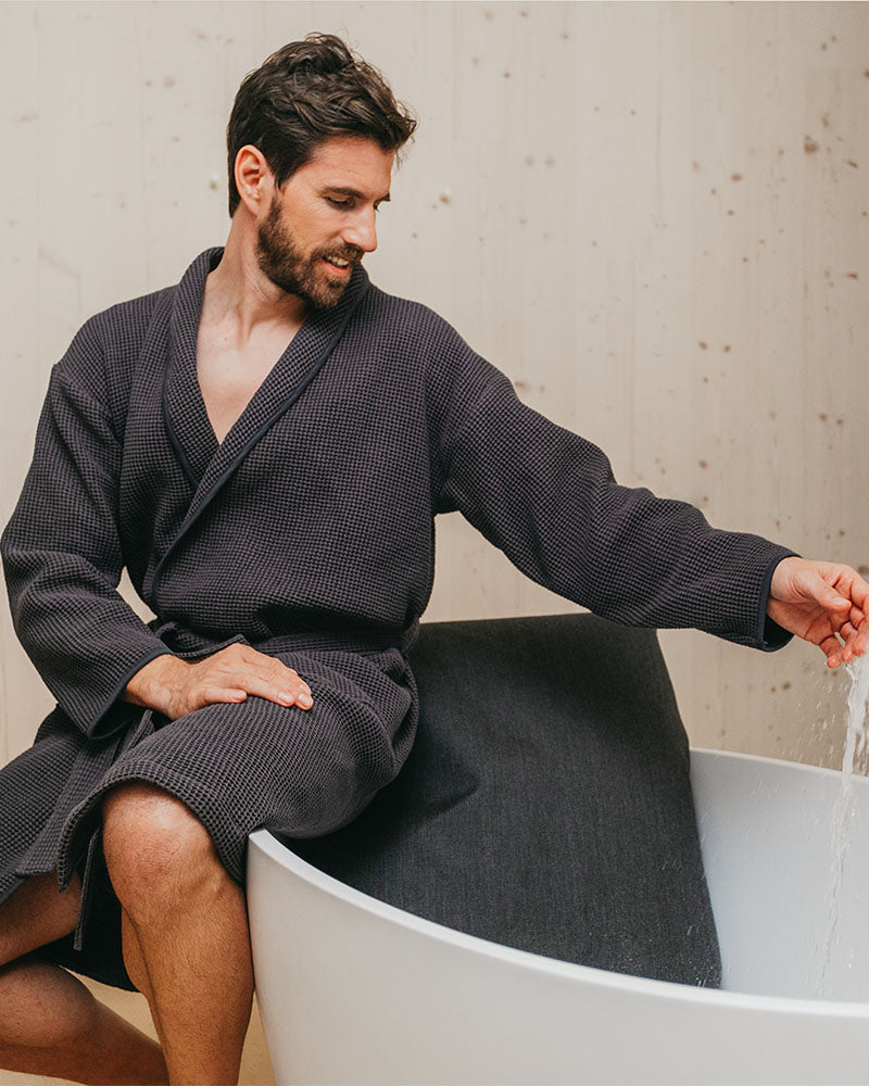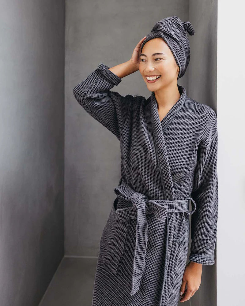 A lightweight, fitted waffle robe made from 100% cotton for elegance and pure comfort.