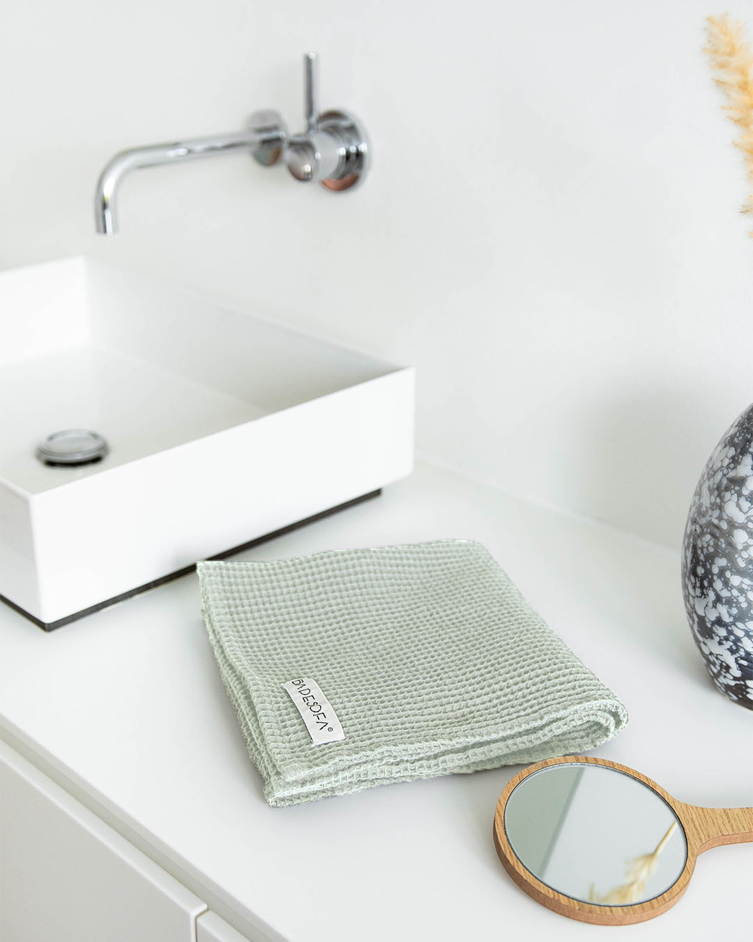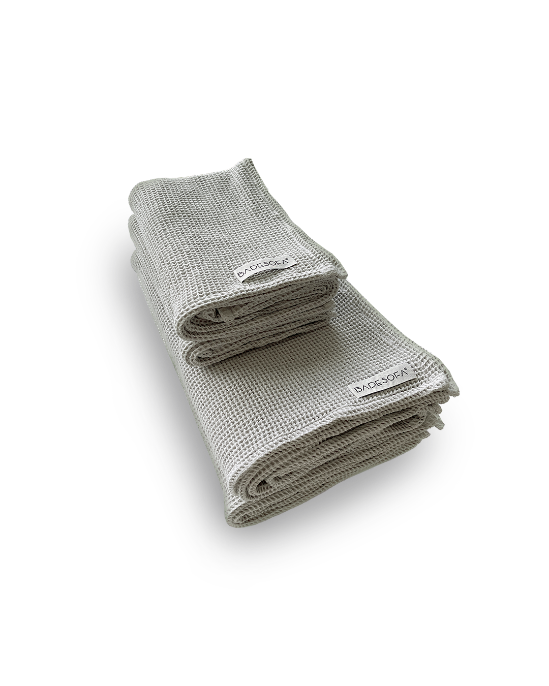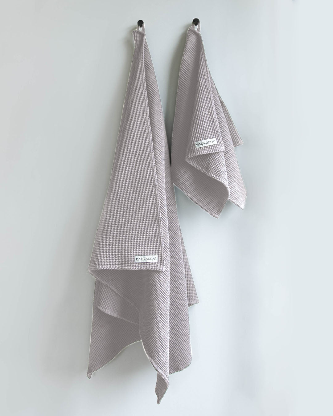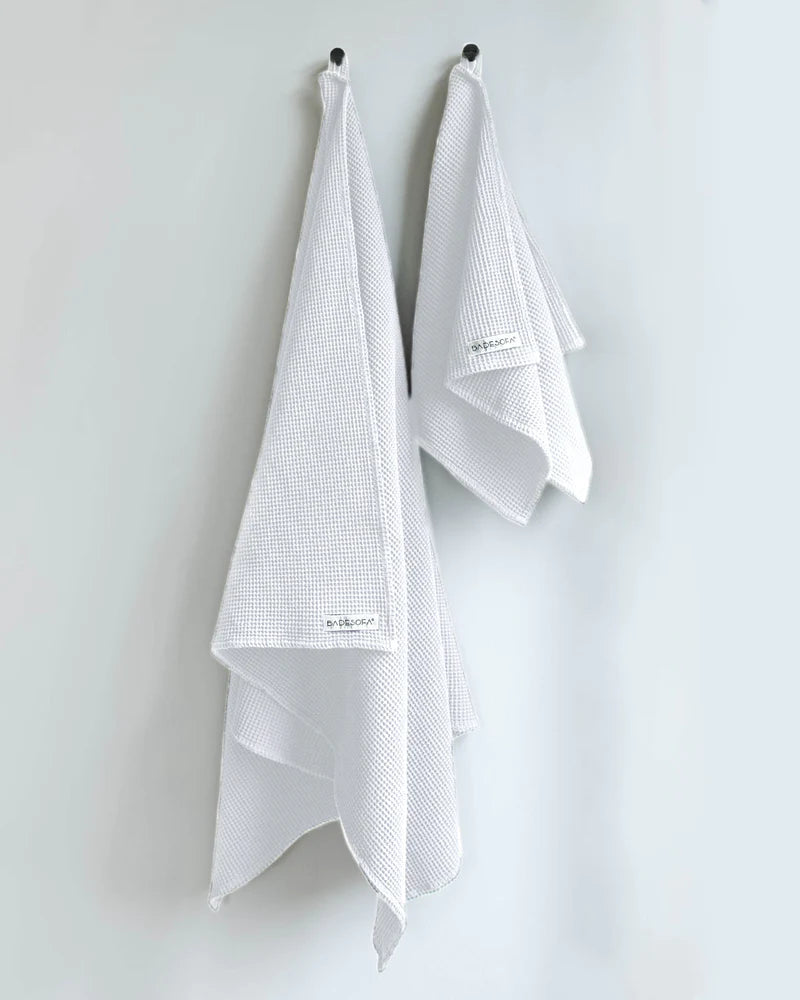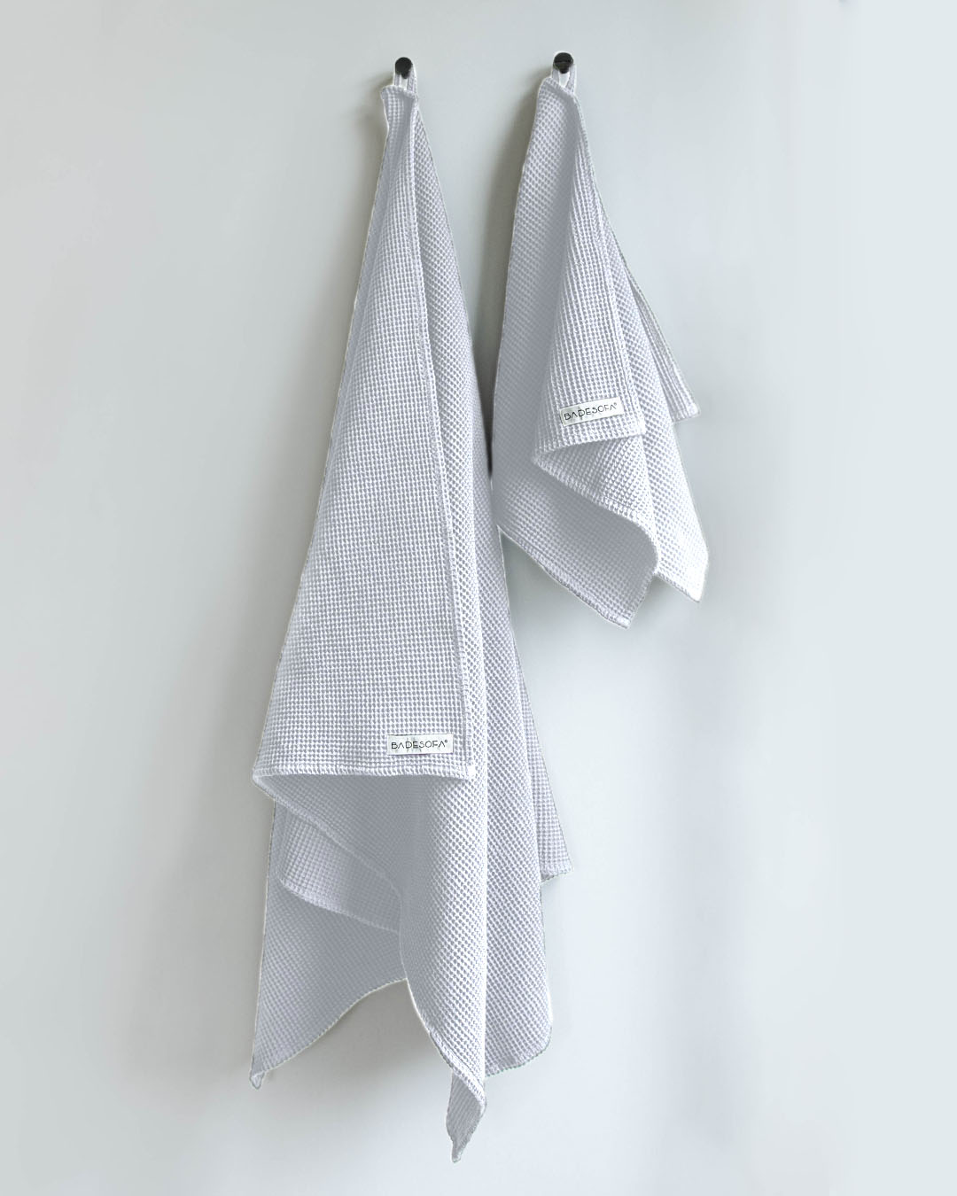 Elegant waffle towel set, made in Portugal from 100% GOTS-certified organic cotton — soft, lightweight, and absorbent.