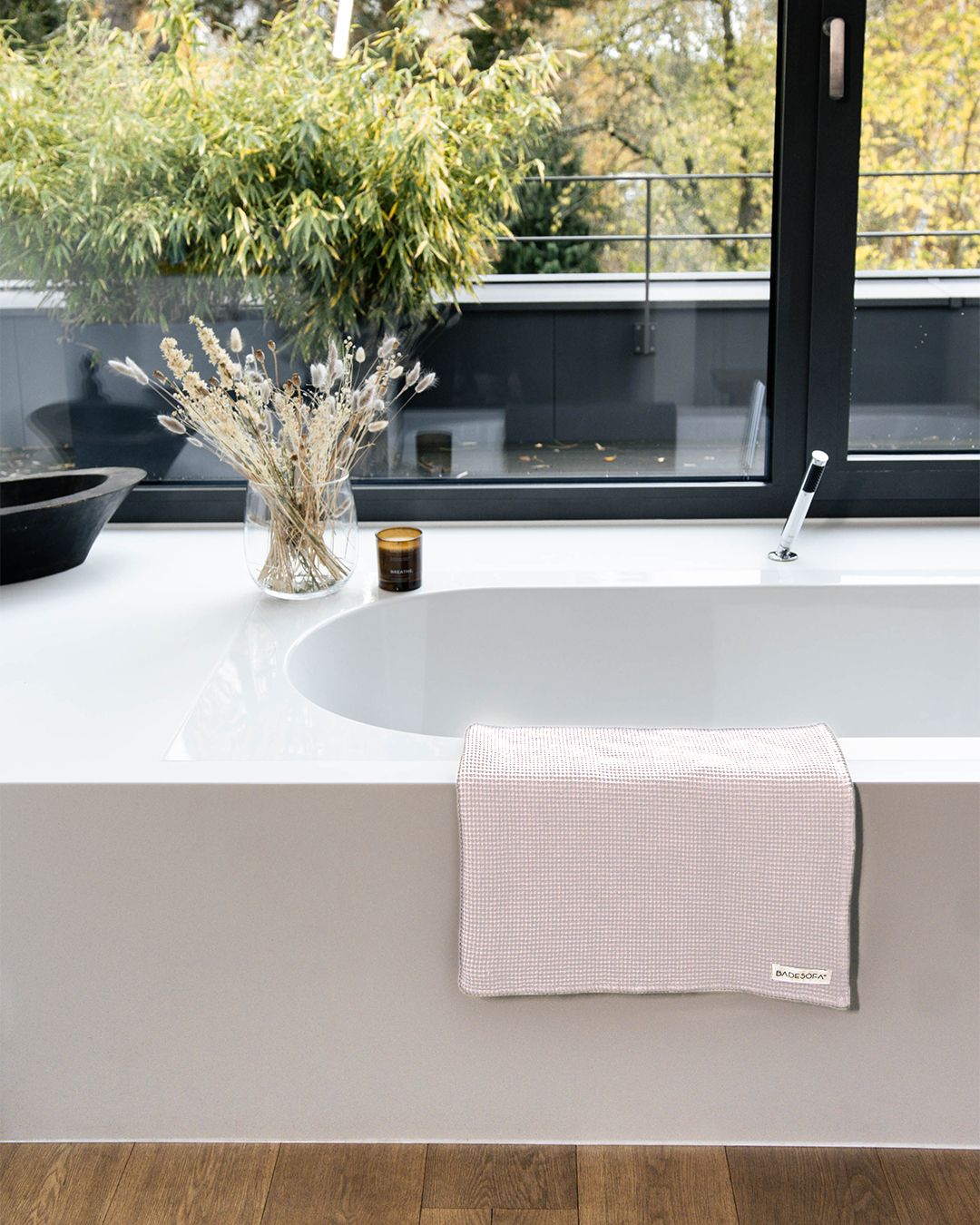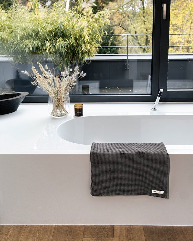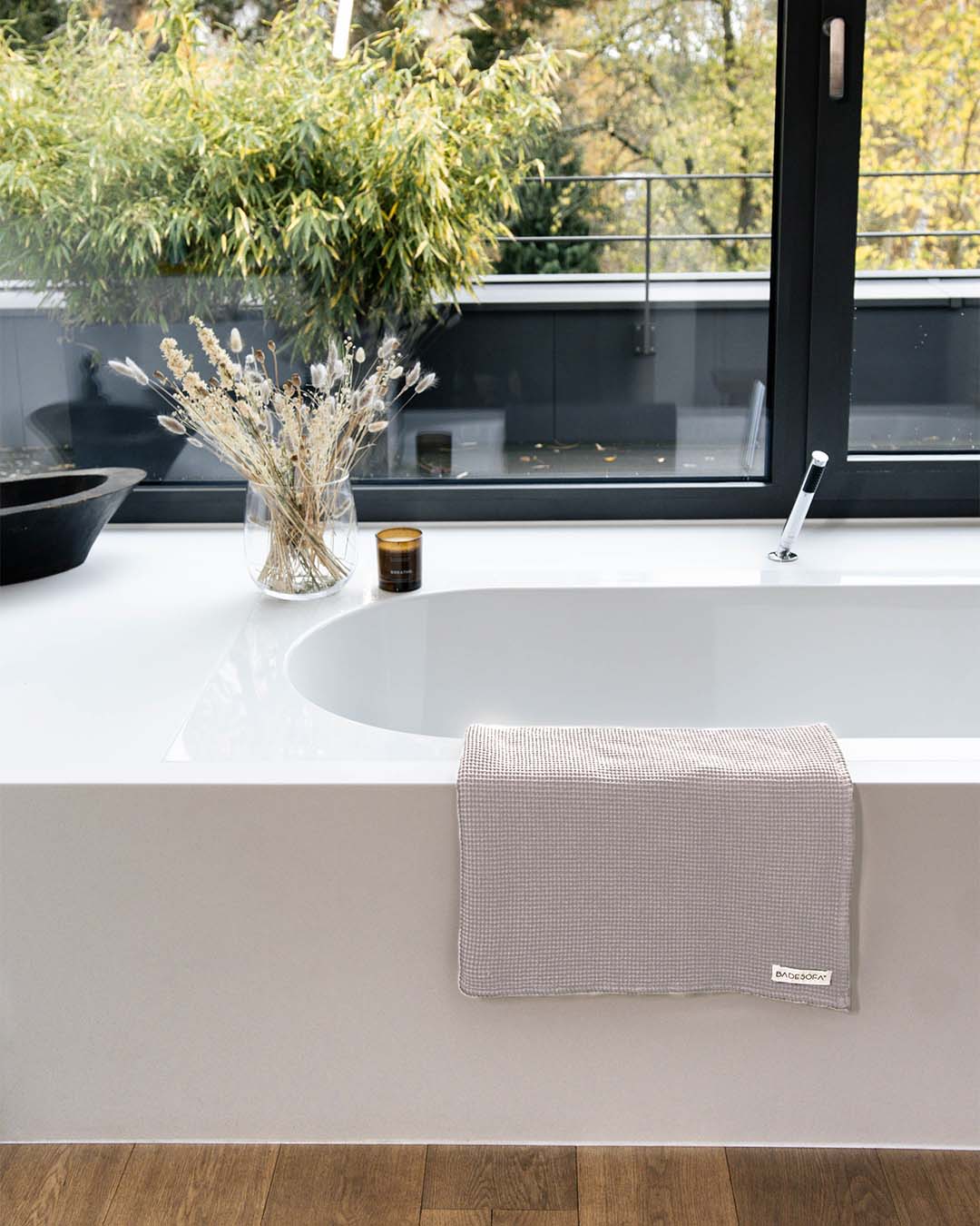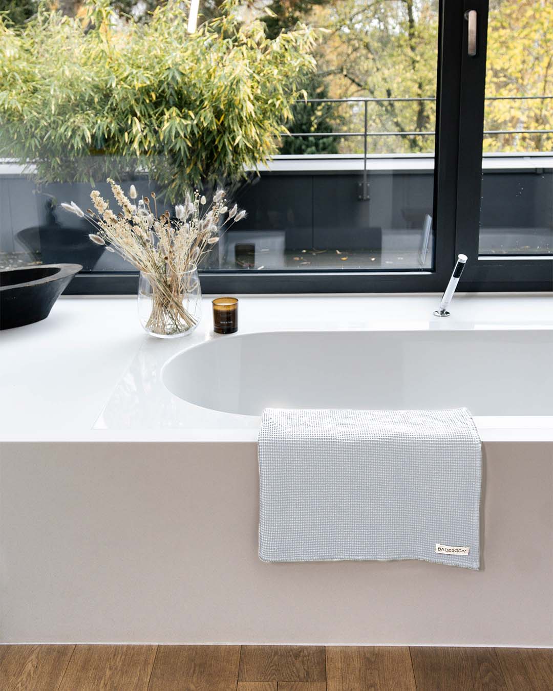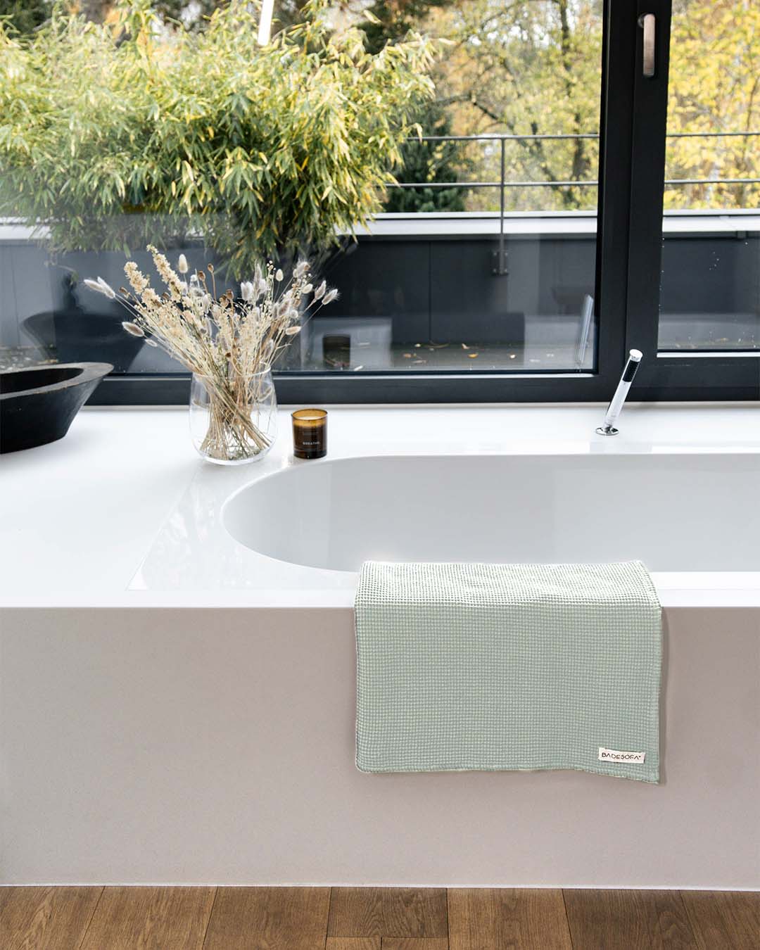 Elegant waffle towel set, made in Portugal from 100% GOTS-certified organic cotton — soft, lightweight, and absorbent.