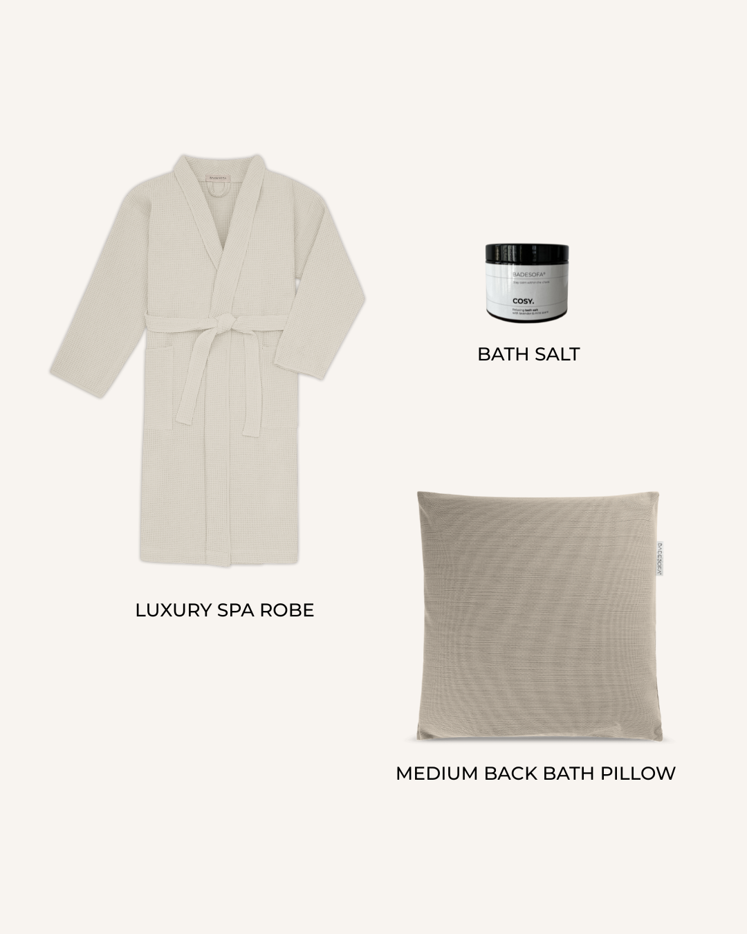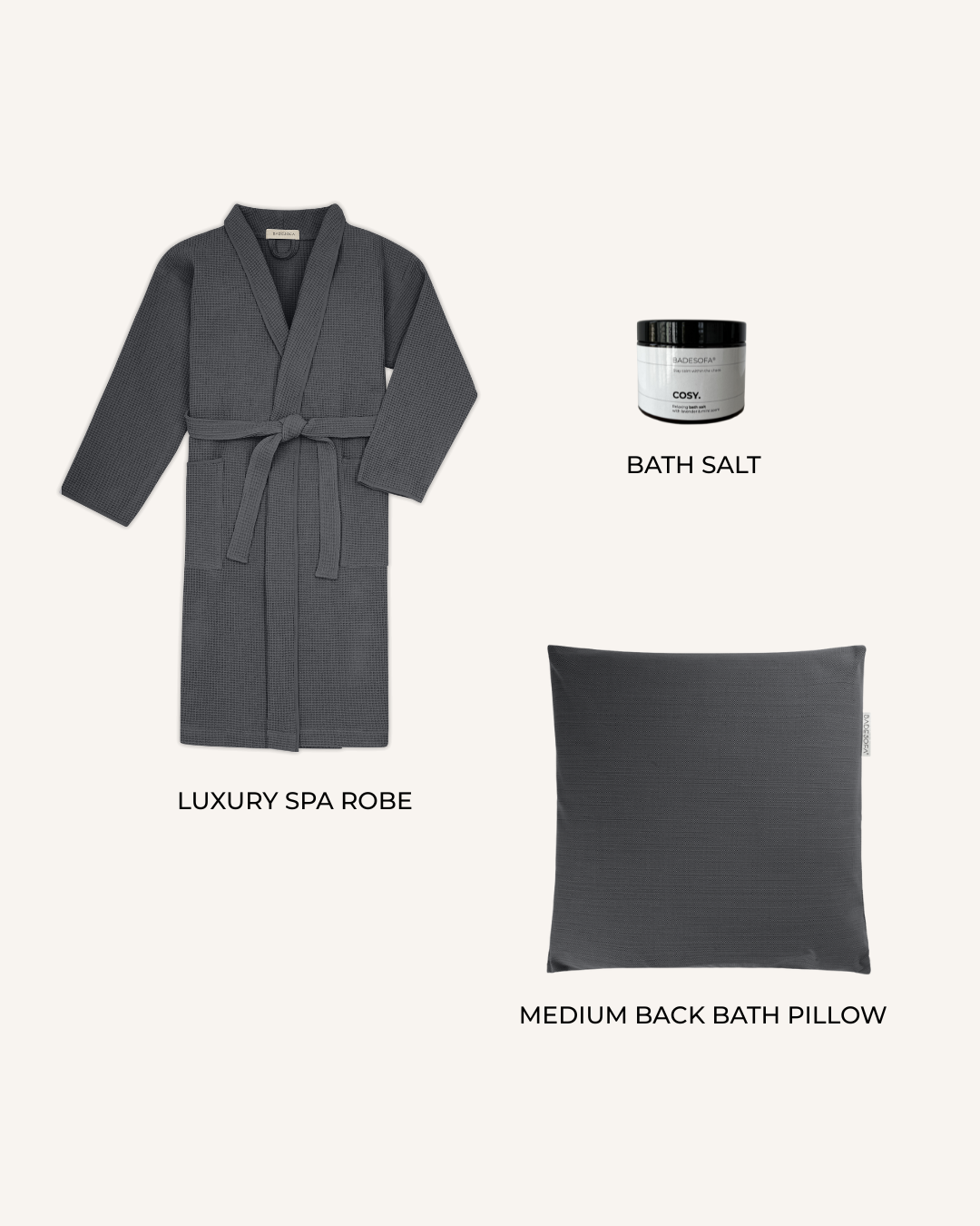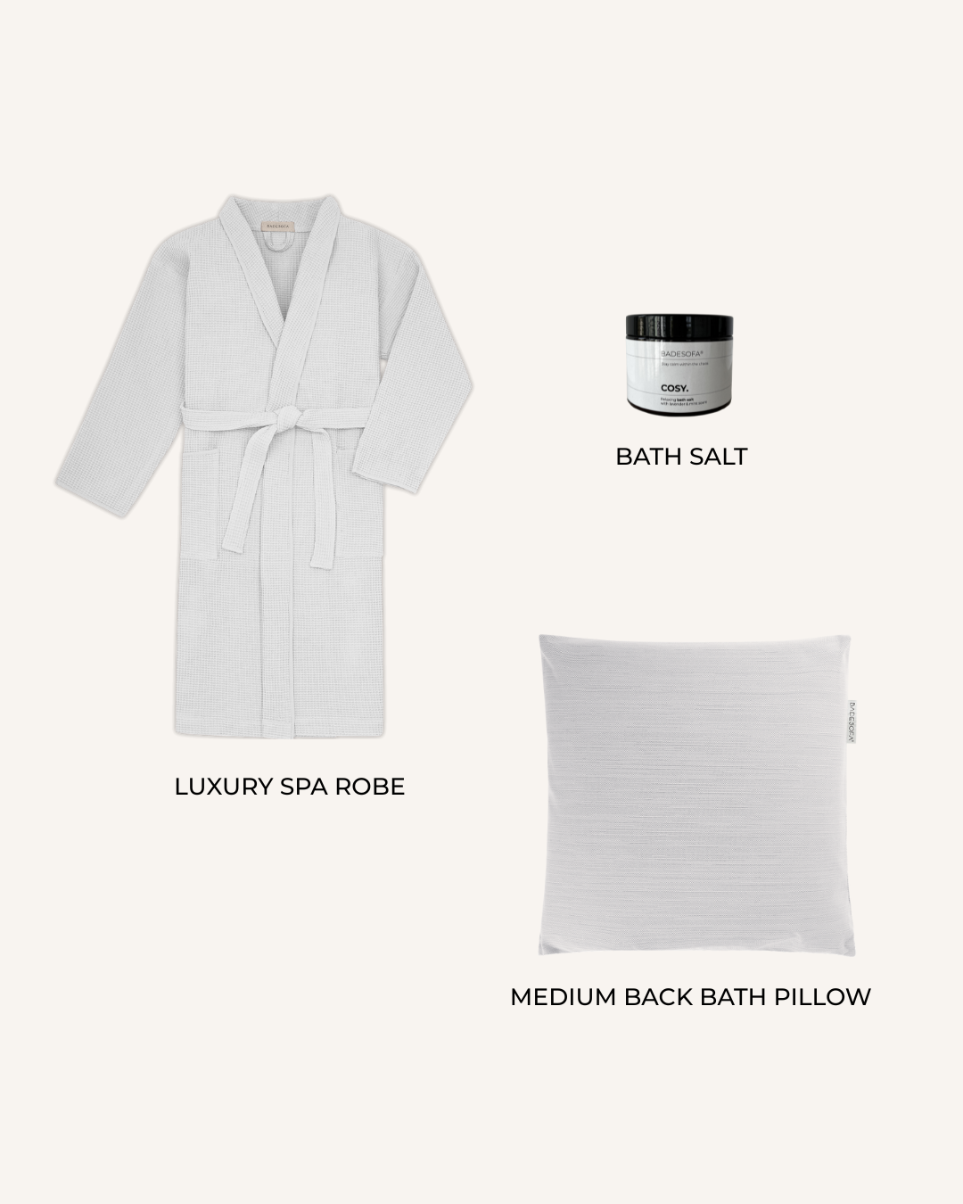 Designed for smaller tubs, this set includes a medium bath pillow, robe, and bath salt for at-home relaxation.