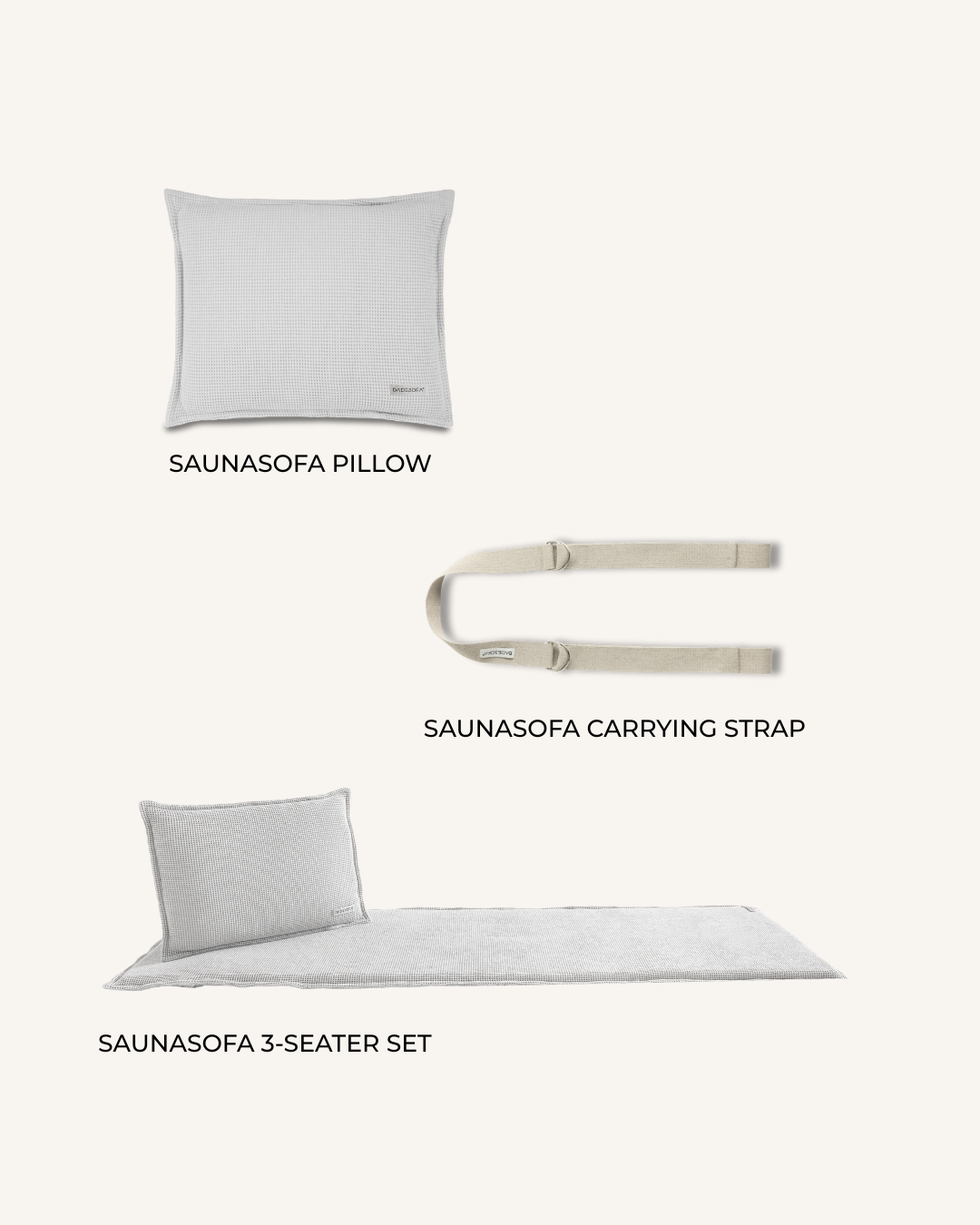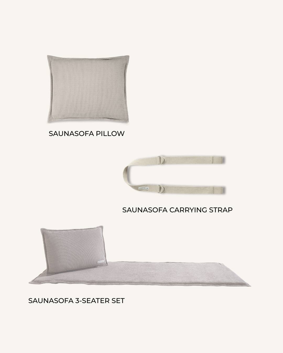 To keep your SAUNASOFA fresh and long-lasting, let all parts dry thoroughly after each use. The removable cover is machine-washable at 40°C – simply turn it inside out, close the zipper, and wash. Afterward, pull it into shape while damp or lightly iron it to make re-covering easier.